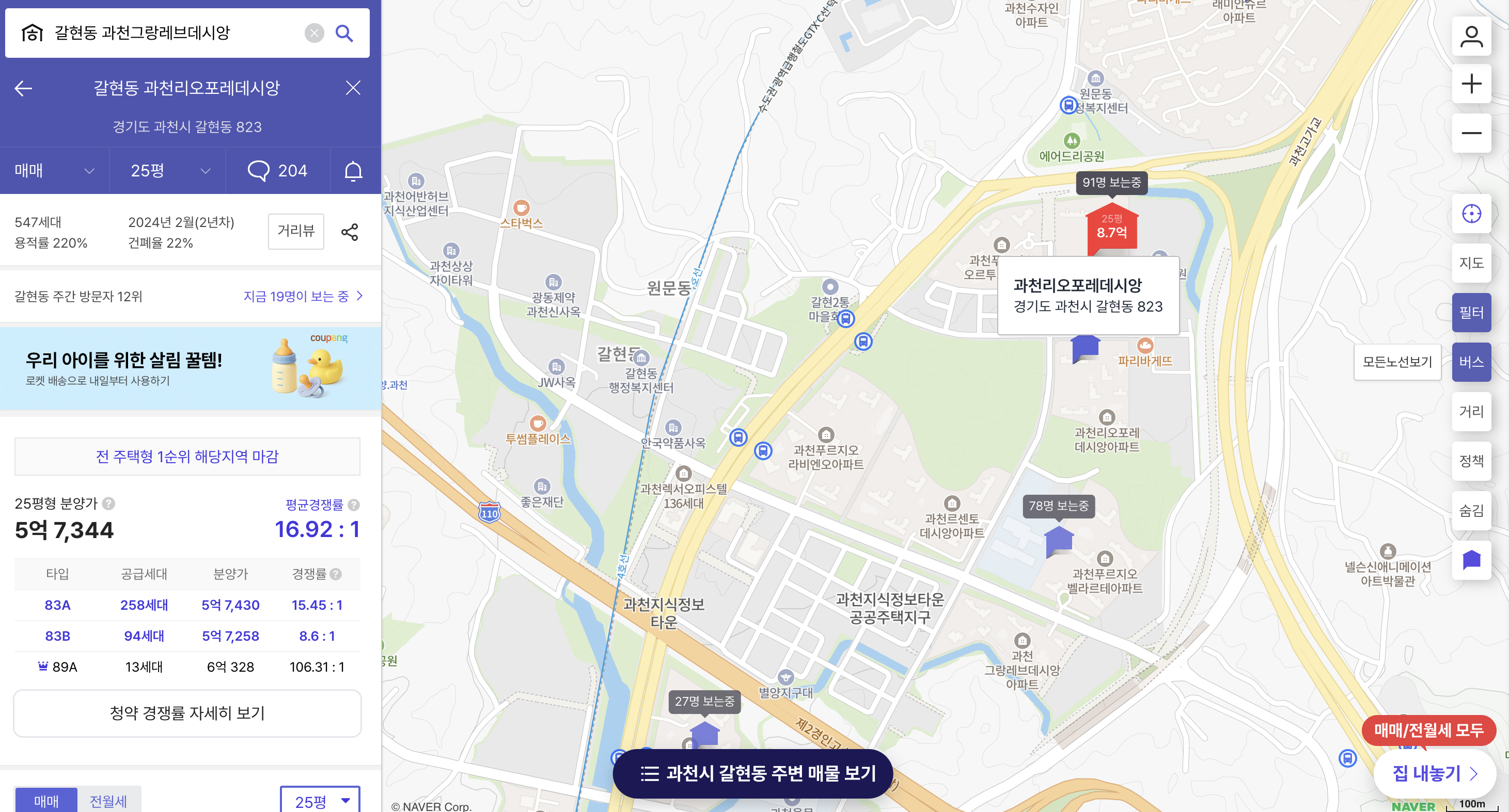 그런데 바로 옆 단지인 ‘과천푸르지오벨라르테(2023년 6월 입주)’의 동일 면적 실거래가는 2024년 하반기 기준 23~24억 원 선이다.즉, 입주 전 10억 원 이상 프리미엄이 붙는다는 이야기다.